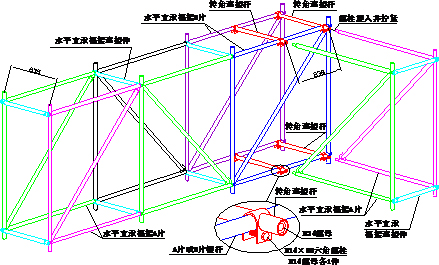 (5)组装水平支承框架时,其水平支承框架上下均应穿入水平支承框架连接杆,然后再连接另一个标准节,使内外水平支承框架在组装后,因连接杆的连接构成一个整体的空间桁架结构(如图所示)。