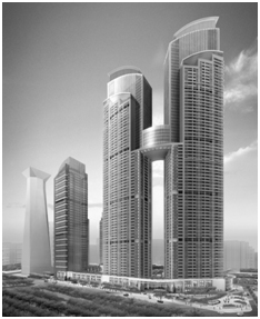 东海国际中心(公寓综合体)工程 位于深圳市福田车公庙片区招商银行大厦西侧。由两栋成45度角的塔楼及商场裙楼组成,A塔82F高308.62m,B塔75F高283.61m,框筒结构,建筑面积约22万平米,与已建成的办公楼和在建的酒店一起构成深南大道两旁最大的综合建筑群,建成后将成为深圳景观最好的顶级服务式公寓,也是深圳中心区新的地标性建筑。东海项目属超高层,楼层多,模板周转材料需求量大,其标准层(4F以上)均采用全铝合金模板施工。