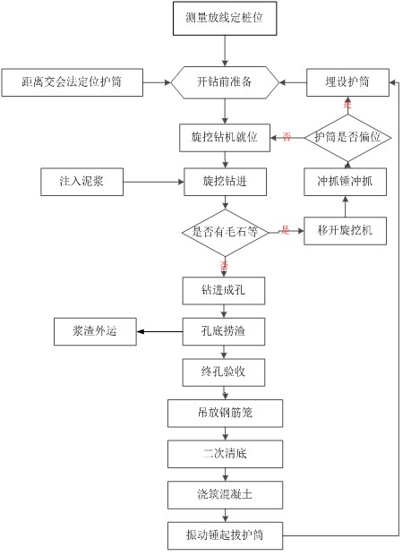 本成桩工艺工艺原理综合了多种成桩工艺:沉管灌注桩振动沉管、全钢护筒护壁工艺,冲孔灌注桩冲孔工艺,旋挖灌注桩旋挖成孔工艺,是以旋挖成孔为主,辅以振动沉管打拔超长钢护筒,利用冲孔成桩工艺冲抓漂石层的组合成桩工艺方法。