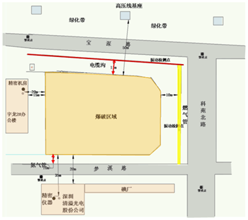 本基坑东侧约10米有Φ200中低压燃气管线,振速要求2.5cm/s;基坑东侧约50米外为某气化站,振速要求3.0cm/s;基坑南侧约35米外为某精密光电仪器制造厂手机腌膜生产车间,振速要求0.2cm/s;基坑西南角约20米外为Φ200钢制氮气管线,振速要求1.0cm/s;基坑西侧约20米为某计算机通信设备制造厂精密机房,振速要求为1.0cm/s;基坑北侧约10m有一条电缆沟,基坑北侧约30m左右有铁塔架高约25m的110KVA高压电线,基坑北侧80米外为某高速公路。项目周边场地条件特别复杂,爆破振速要求十分严格。